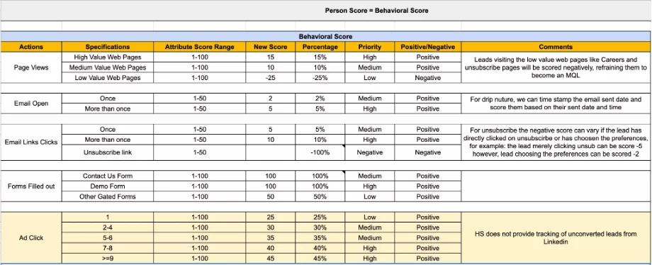 Some businesses see potential conversion growth if/when someone registers and attends a webinar and some would say when they download an asset like a White Paper, Case Study, etc, or a majority of the time it fills out a contact us form. So giving weightage to scoring depends upon the business.